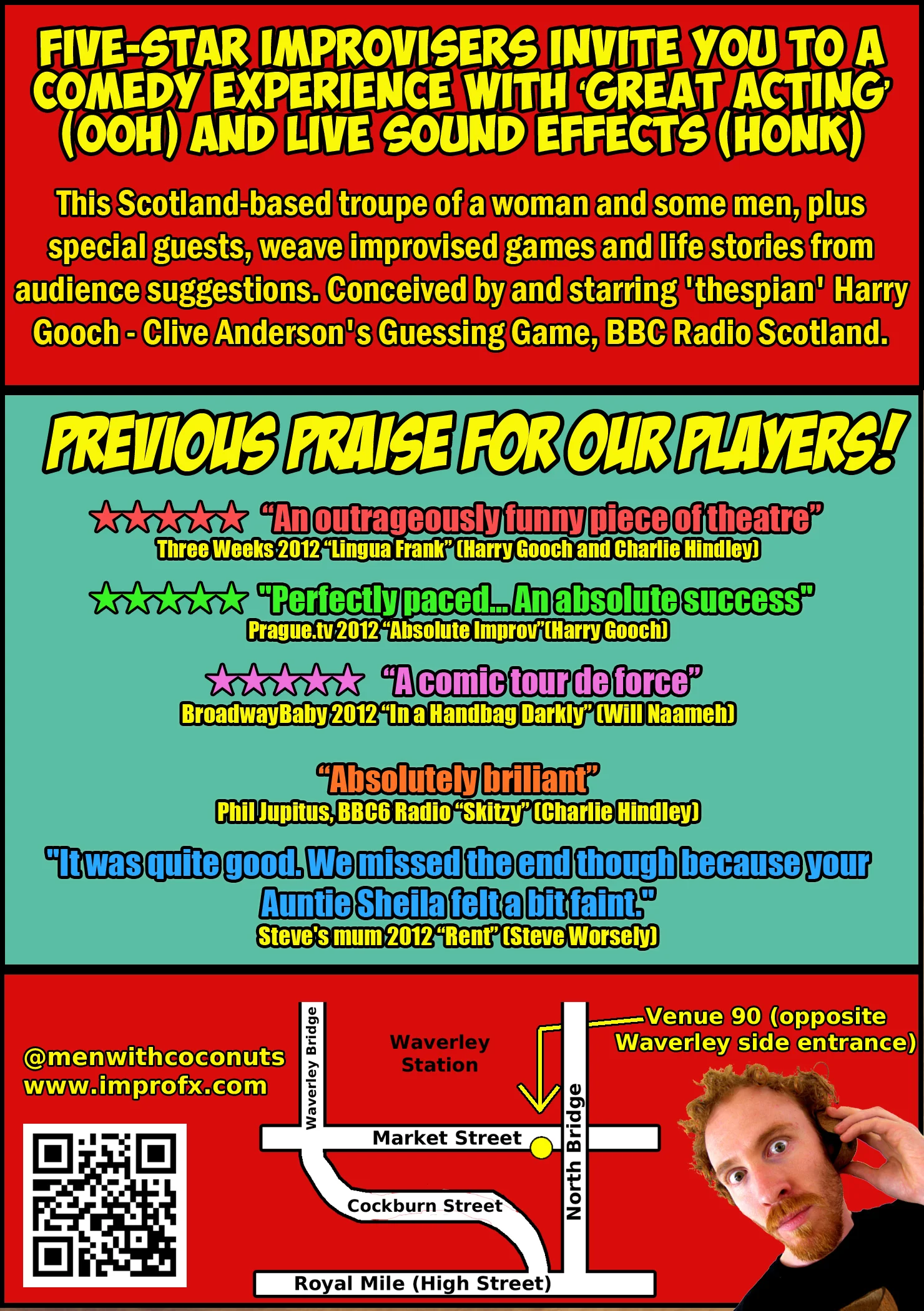 Impro FX's debut show! An hour-long mixture of improvised games and stories, all with the added twist of live sound effects. Every day, the Impro FX players (plus special guests) played games and created scenes based entirely on audience suggestions.