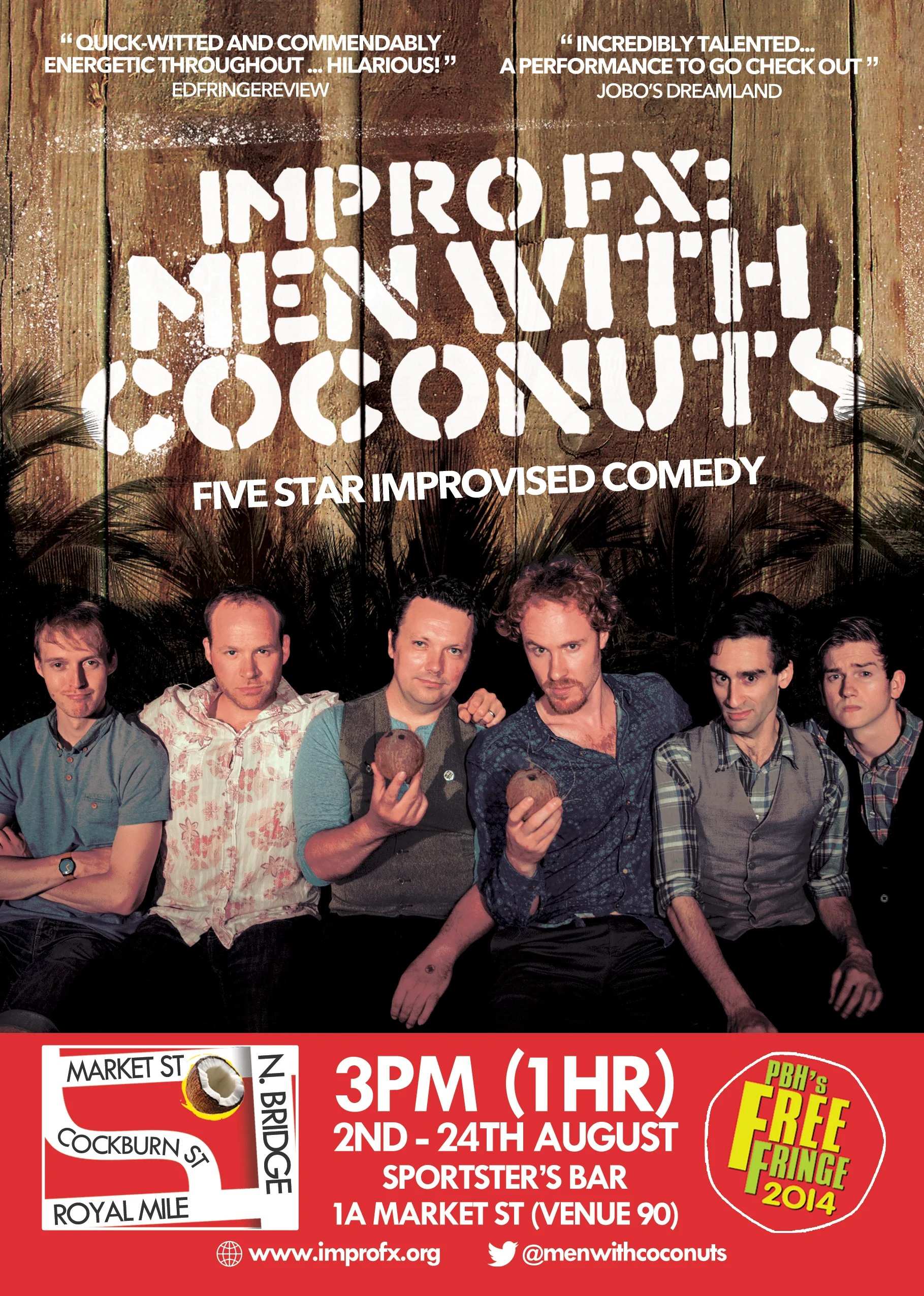 "Men With Coconuts" ran at the 2014 Edinburgh Festival as part of PBH's Free Fringe, performing every day at Sportsters Bar (Venue 90), 3pm (1hr). An hour of improvised comedy games, scenes and sketches.