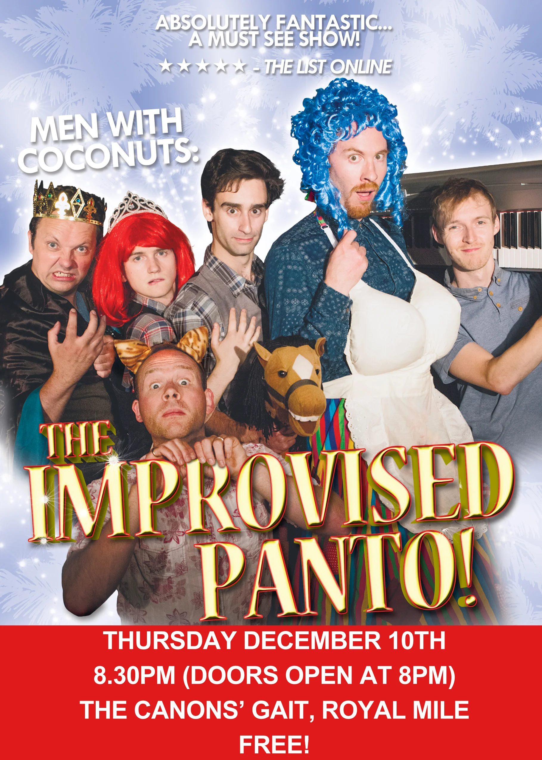 "Men With Coconuts: The Improvised Panto" enjoyed an extremely successful 23-show run in the 2014 Edinburgh Fringe, to packed houses and five-star critical acclaim.